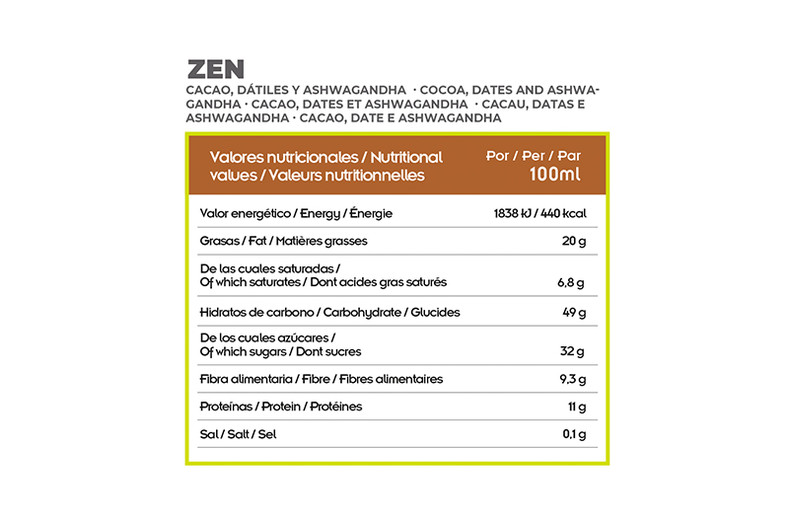 Ingredienti: Datteri*, mandorle*, cacao tostato*, cacao*, ashwaganda*